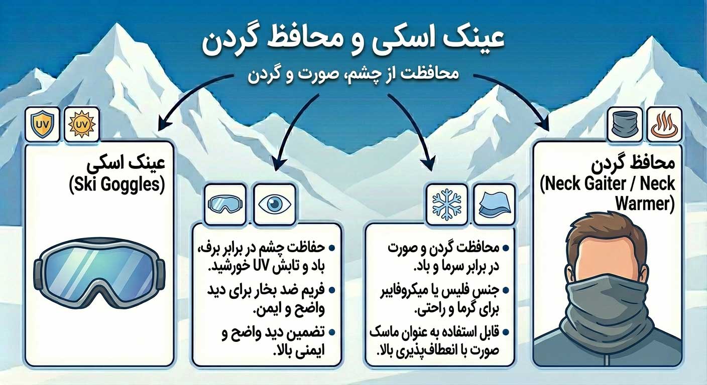 - عینک اسکی و محافظ گردن: برای دید بهتر و محافظت در برابر باد و سرما.