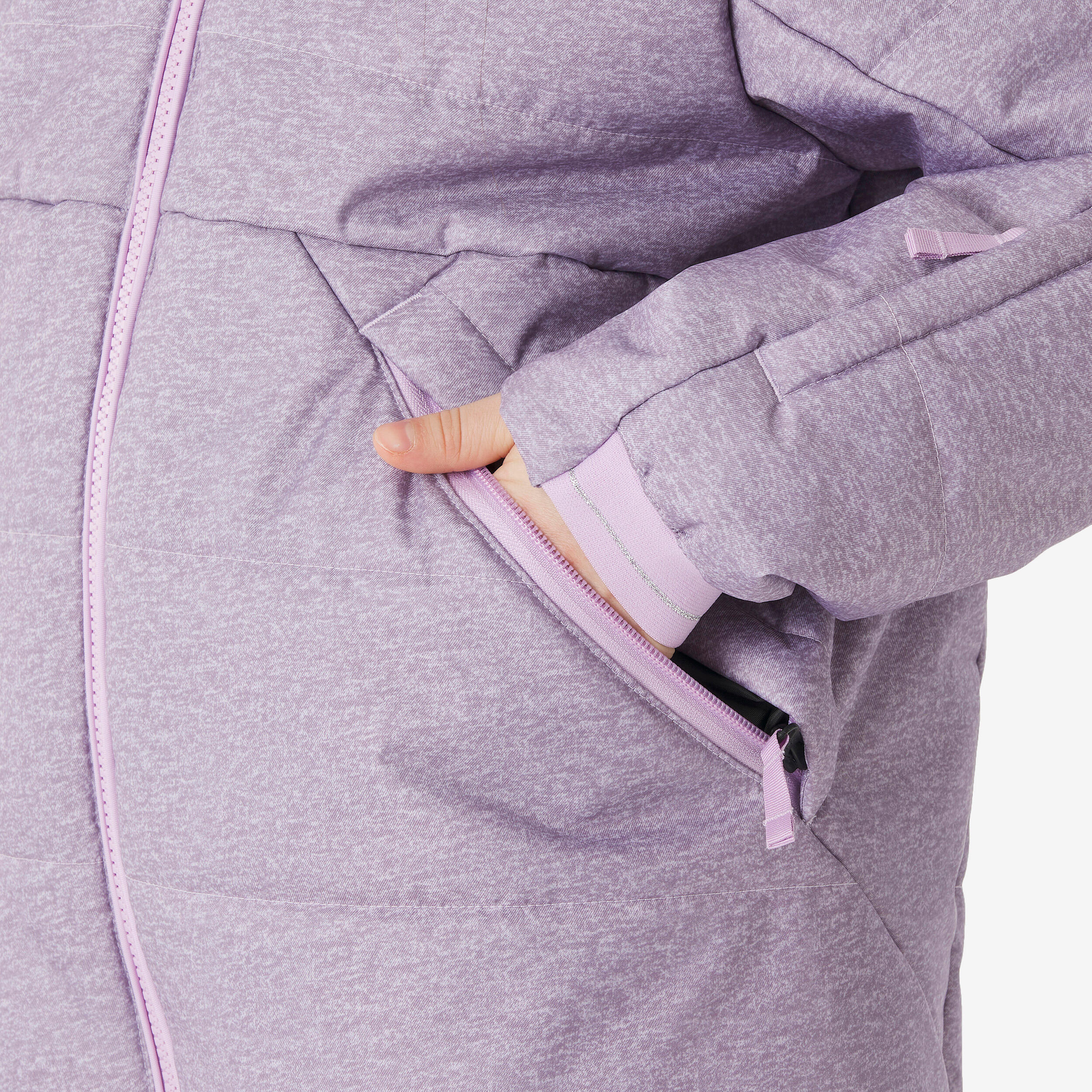کاپشن اسکی پفدار کودک Wedze مدل 100 Warm با ترکیب رنگ صورتی و طرح لئوپارد، یک کاپشن گرم، سبک و بسیار راحت برای اسکی و بازی در برف است.
