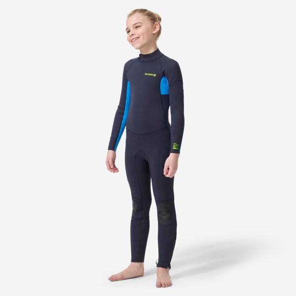 لباس غواصی بچهگانه OLAIAN مدل 100 Junior با ضخامت ۲/۲ میلیمتر و رنگ سرمهای، محافظی ایدهآل برای کودکان هنگام فعالیتهای آبی مانند موجسواری، شنا و ورزشهای تفریحی در آب است.
