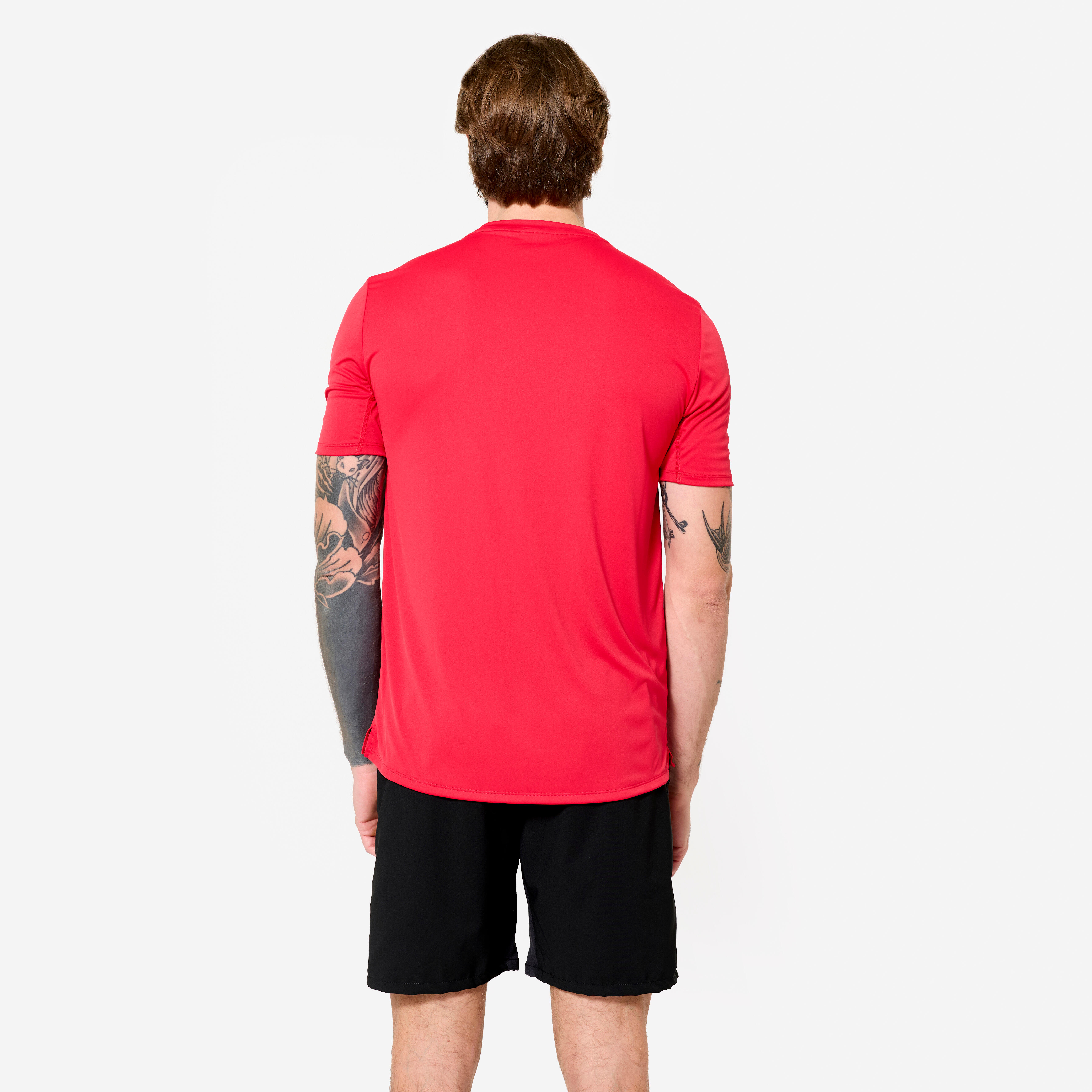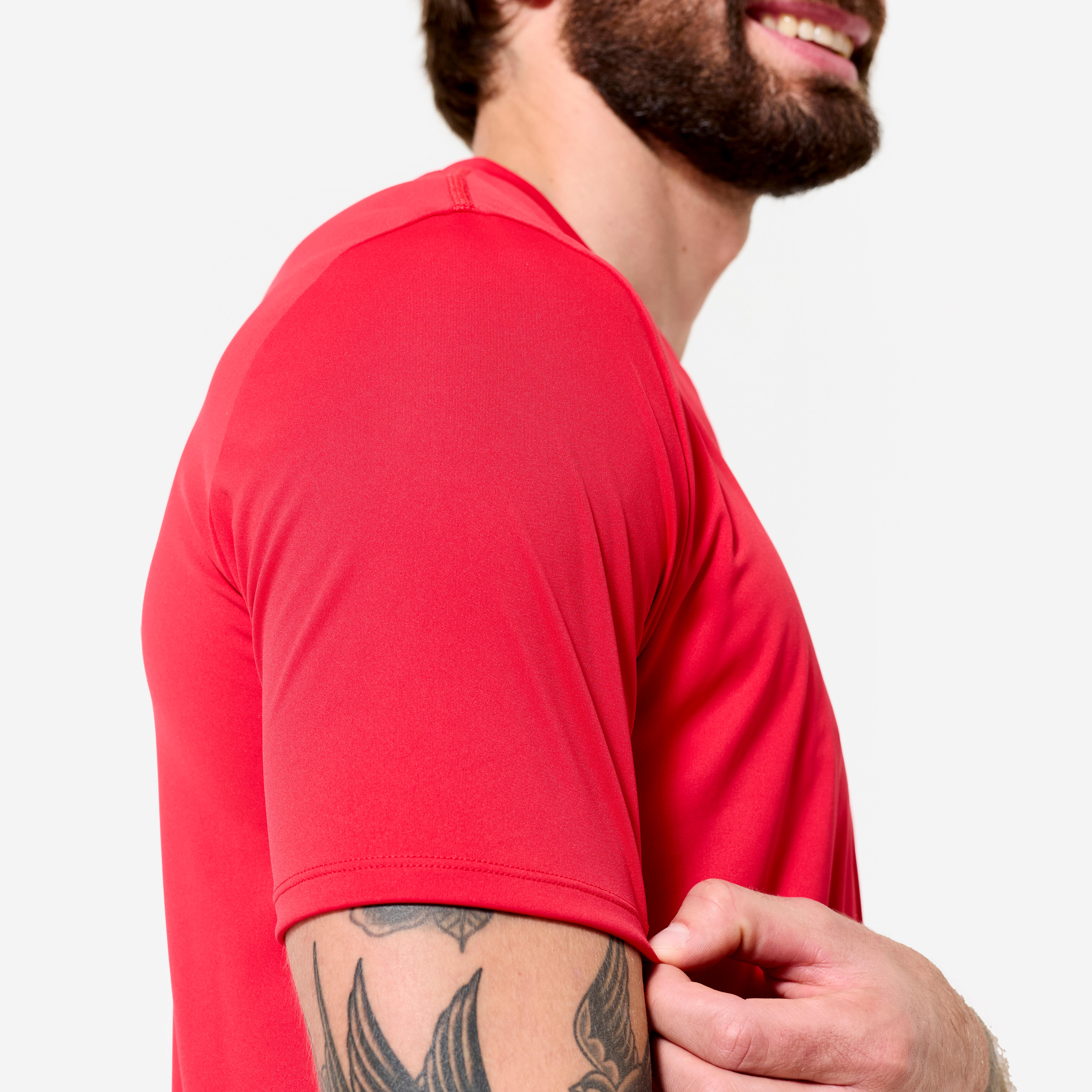 این تیشرت قرمز رنگ با آستین کوتاه و یقه گرد، آزادی حرکت کامل و راحتی طولانیمدت را در طول تمرین فراهم میکند.