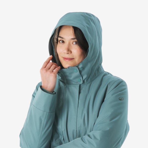 کاپشن ضدآب زنانه برند کچوا مدل NH500 با رنگ سبز، طراحی شده برای محافظت در برابر سرما و رطوبت در شرایط آب و هوایی سرد و برفی.